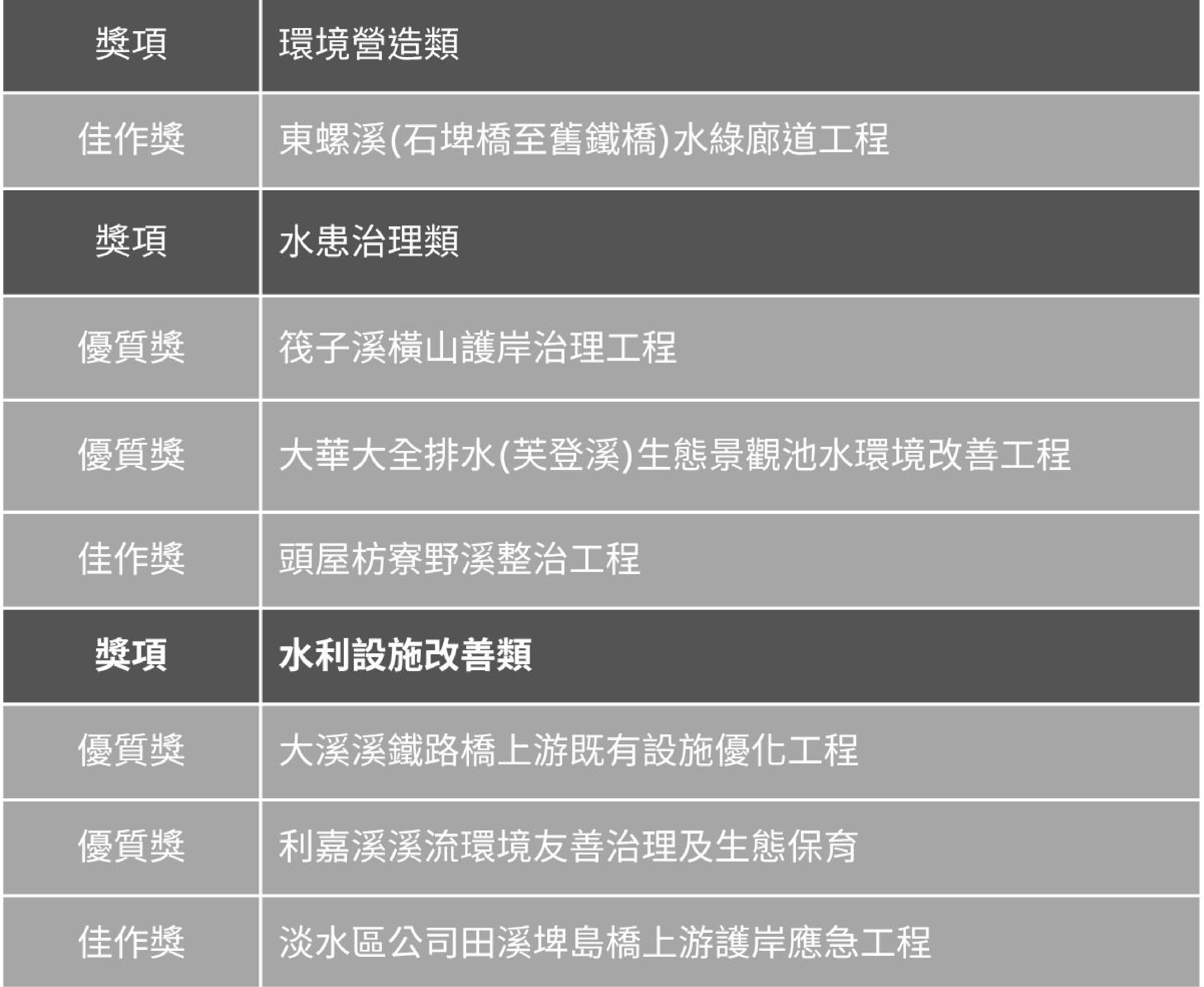 台灣河川希望工程獎分為「環境營造」、「水患治理」、「水利設施改善」三類,獎勵依據不同施政計畫,卻選擇以「減法」精神呵護河溪、修復河溪的優良河川工程。此次頒獎典禮共計頒出以下7件: