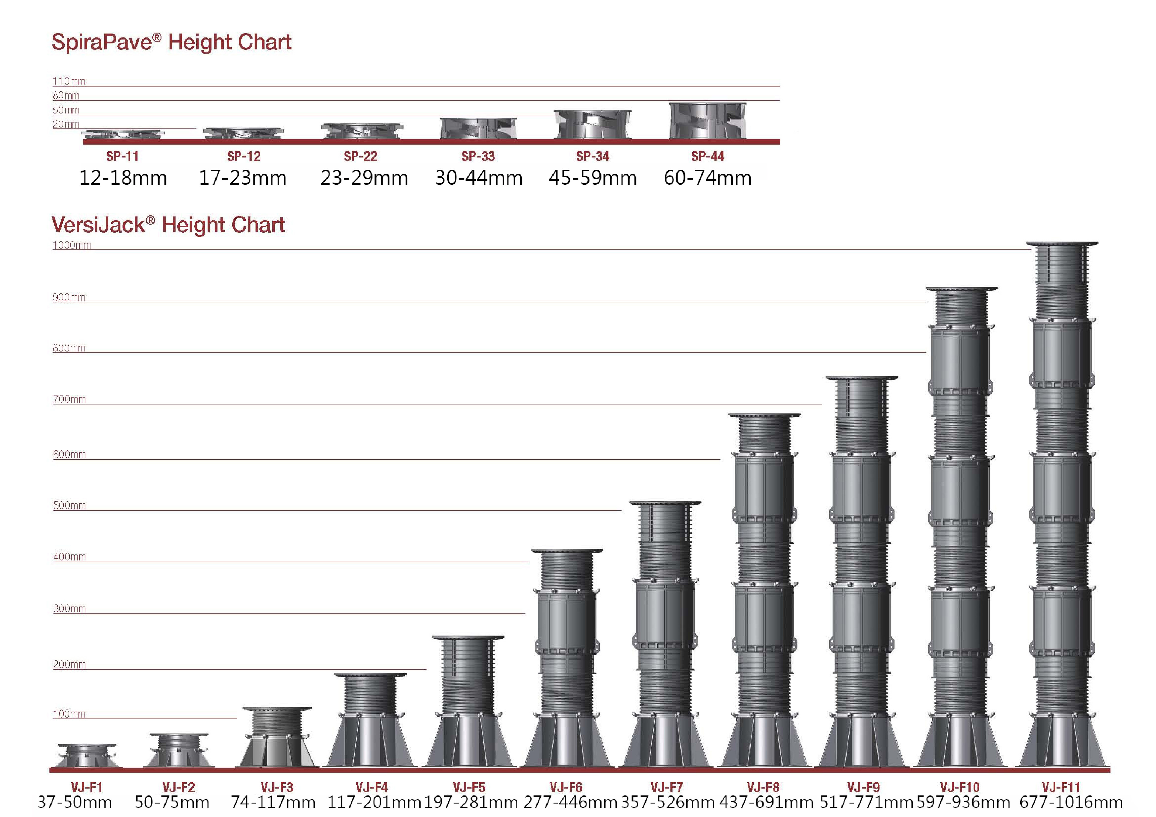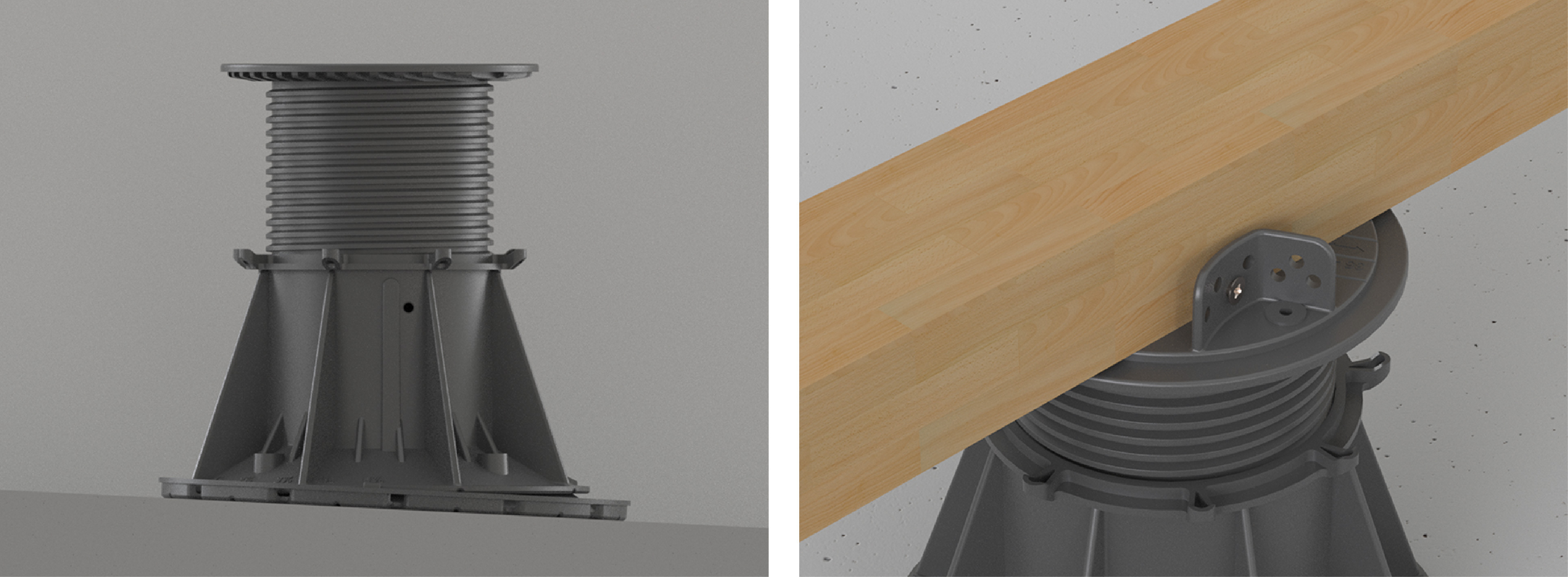 毫米級高度調整:基座的高度可以透過旋轉或增加連結器去調整高度,範圍從數公分到超過一公尺,讓施工人員輕鬆實現完美水平的鋪面。