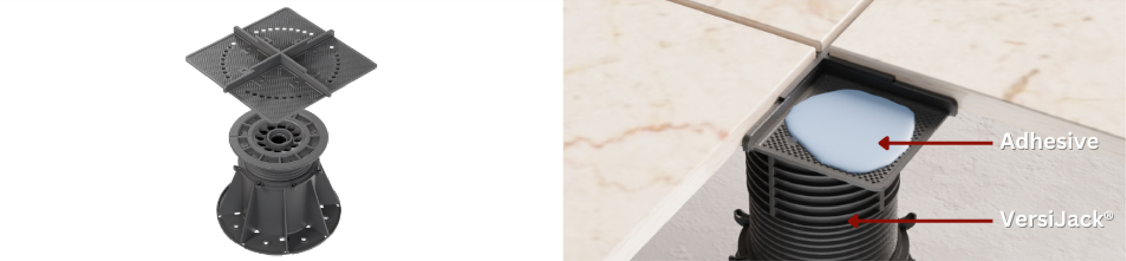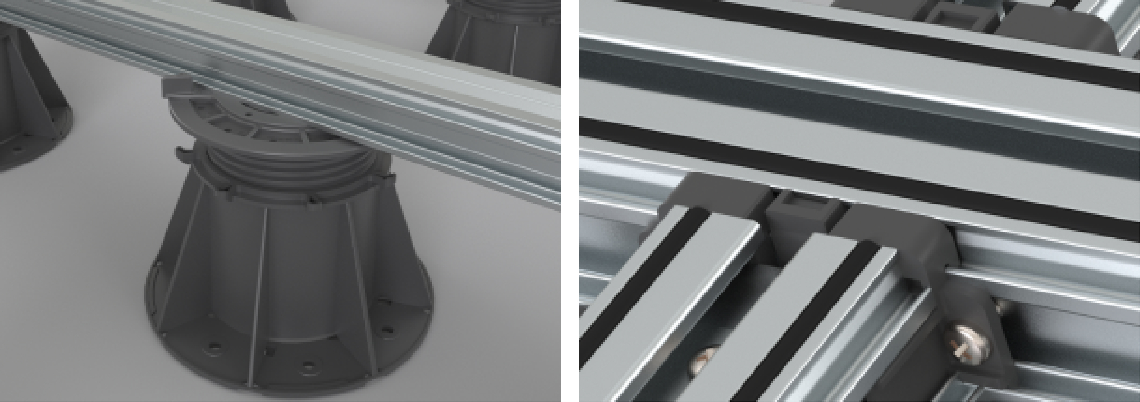 快速整合安裝:VersiFrame® 的設計與VersiJack®完美整合,採用基座頂部卡扣配件即可快速固定,也可快速調整水平。簡化現場施工複雜度,實現快速安裝。