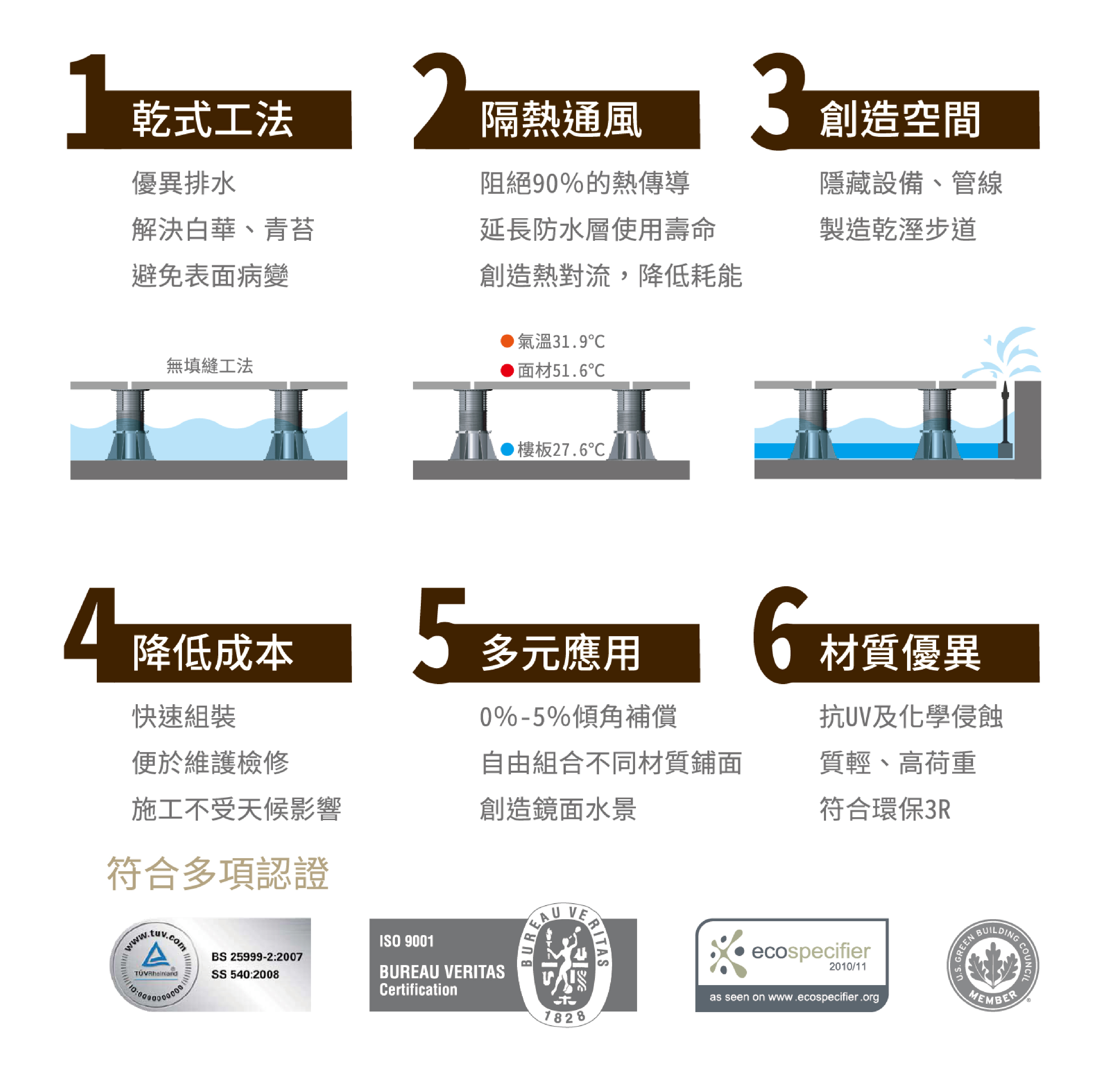 - 卓越的排水效能:透過基座將鋪面架高,雨水迅速從鋪面間隙流入下方,再由排水系統排走,有效避免表面積水和白華、青苔問題,維持鋪面乾爽安全。