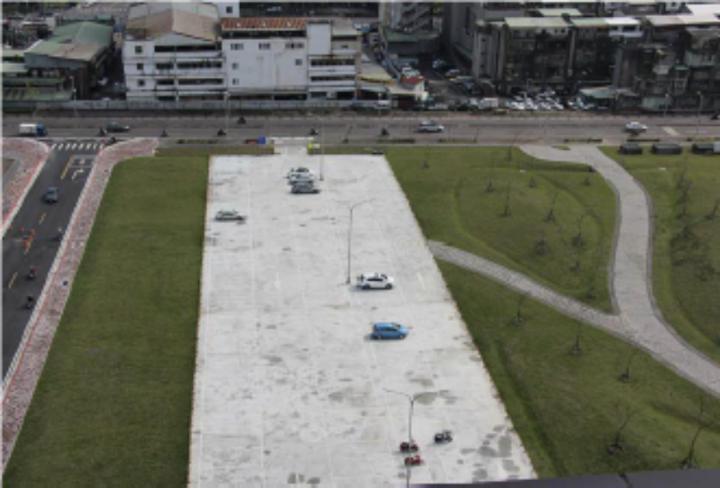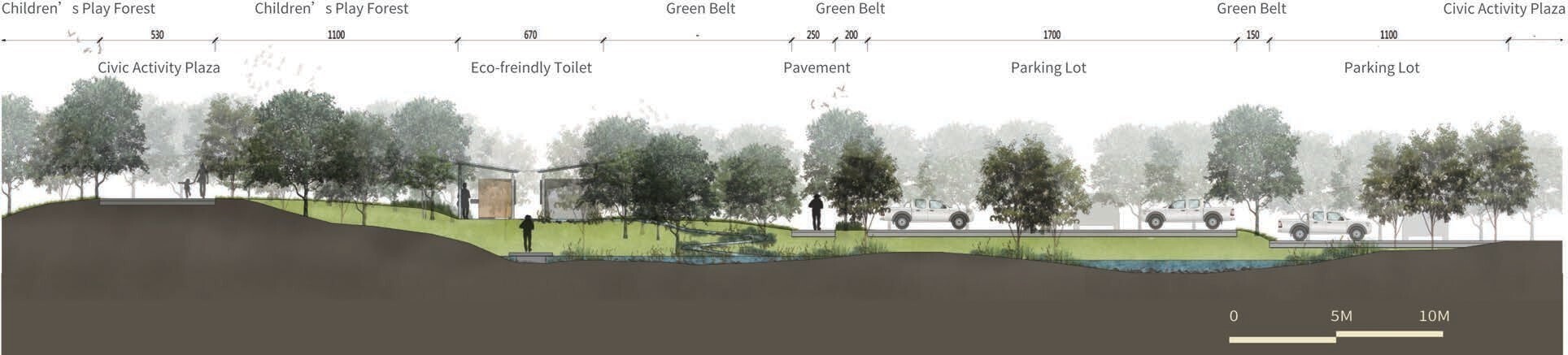 4.公園基地西側未來將興建高樓,我們將地形高點之一設置於公園西南側,在此填丘造林,以抵禦未來可能產生的高樓風。此區綠帶由略為起伏的丘陵草坡、新種闊葉常綠喬木組成,樹種採用臺北市郊山常見喬木 : 土肉桂、楓香、無患子、雀榕,延續鄰近郊山生態,並達到防風效果。