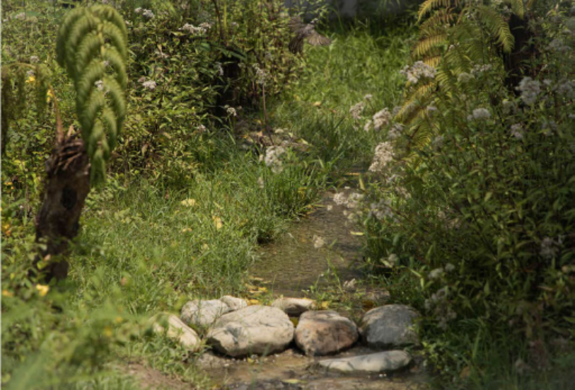 生態廁所屋頂所集的雨水及洗手檯排水,隨著設計水道,進入濕地營造的溪流路徑,融入雨水過濾循環系統之一環,徹底實踐永續環境的精神。