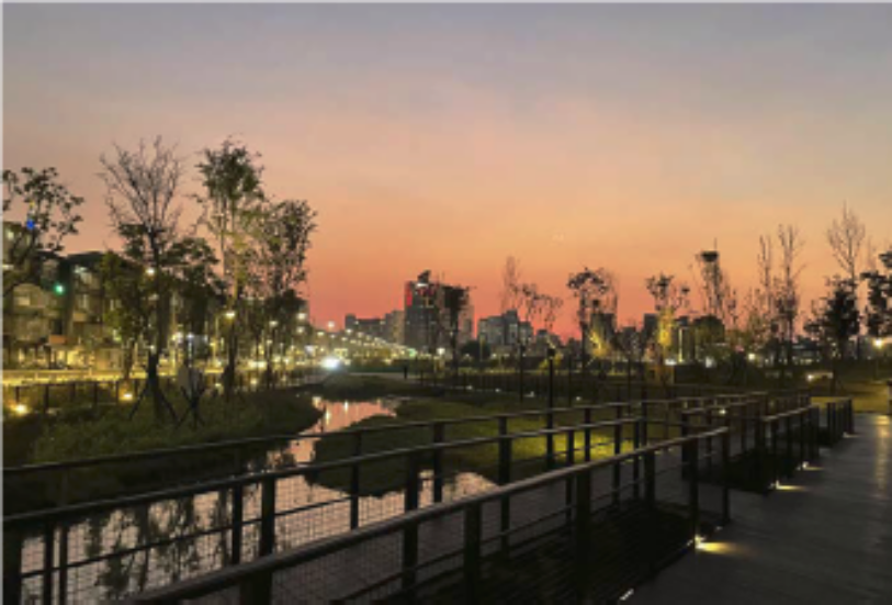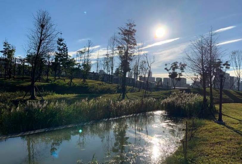 (1)園內新植 28 種喬木 491 棵、24 種灌木 5 萬多株、水生植物 1 萬多株,綠化面積約 1.3 公頃,主要人行通道皆採用友善平權設計,以緩坡串接景點,提供安全友善的綠色休憩空間,符合第十一項可持續發展目標 : 讓人們居住在友善平權、安全、韌性、可持續發展的城市與聚落。