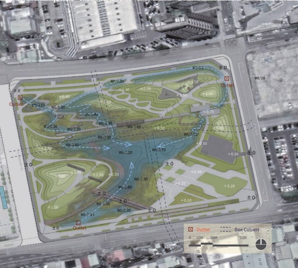 以造水道及滯洪大池的挖土造丘,不僅達到基地內的挖填平衡,更豐厚了園內栽植大量原生植物的基礎填土,大量的植生,克服冬天須承受東北季風嚴苛的氣候條件,成就了舒適宜人的微氣候環境。