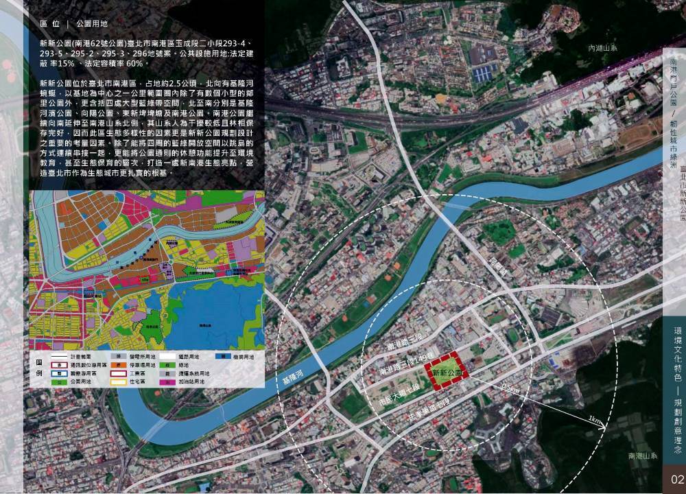 新新公園並不是一般的鄰里公園,而是著眼於串聯跨縣市生活圈的「臺北東區門戶計畫2.0」的一部分。因此在規劃設計這個公園時並不是採行鄰里公園的作法,而是考量了整個臺北市的地理水文狀況,以濕地結構回應區域環境的特色。新新公園基地南有南港山系,北畔基隆河,使用濕地結構回應基地擔負區區滯洪的韌性目標,以及開放式的雨水排水系統,回應未來鄰地密集開發可能造成的微氣候變化。
