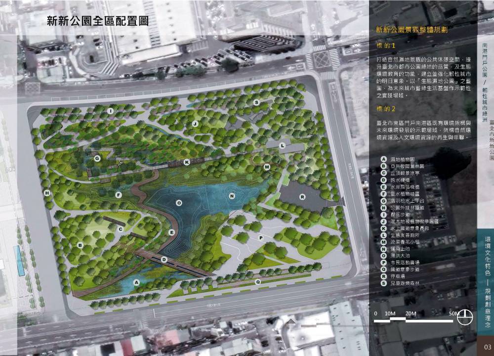 1.北市為多雨盆地,河流短急,因此雨季須防澇,亦須防旱季無水之愁。不同於其它濕地公園或仰賴天候、或仰賴珍貴的自來水源等作法,新新的設計是抽取來自地下雨水箱涵作為主要水源,並栽種水生植物過濾水質,創造友善自然與居民的親水生態,令新新除了滯洪功能外,亦充分再利用、回收、淨化原本已近排放端的雨水。