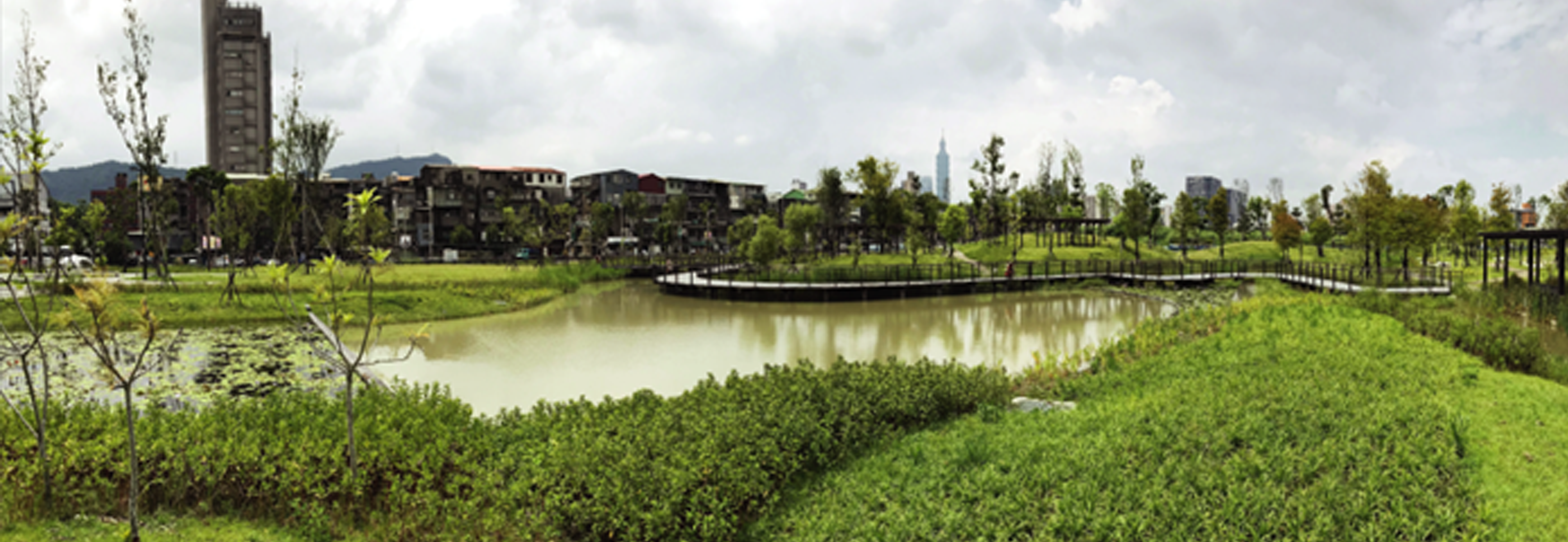 座落於臺北市東區的核心區位,是臺北市第一座以生態濕地為主題之大型公園,面積約2.5公頃。藉由蜿蜒水道及選植多種水生植物過濾水質,公園完全落實雨水滯洪與濕地循環城市淨化功能,挖溝造丘,營造地景,讓公園徹底發揮韌性城市的生態景觀功能,以水與綠提供休閒生活的理想場域。
