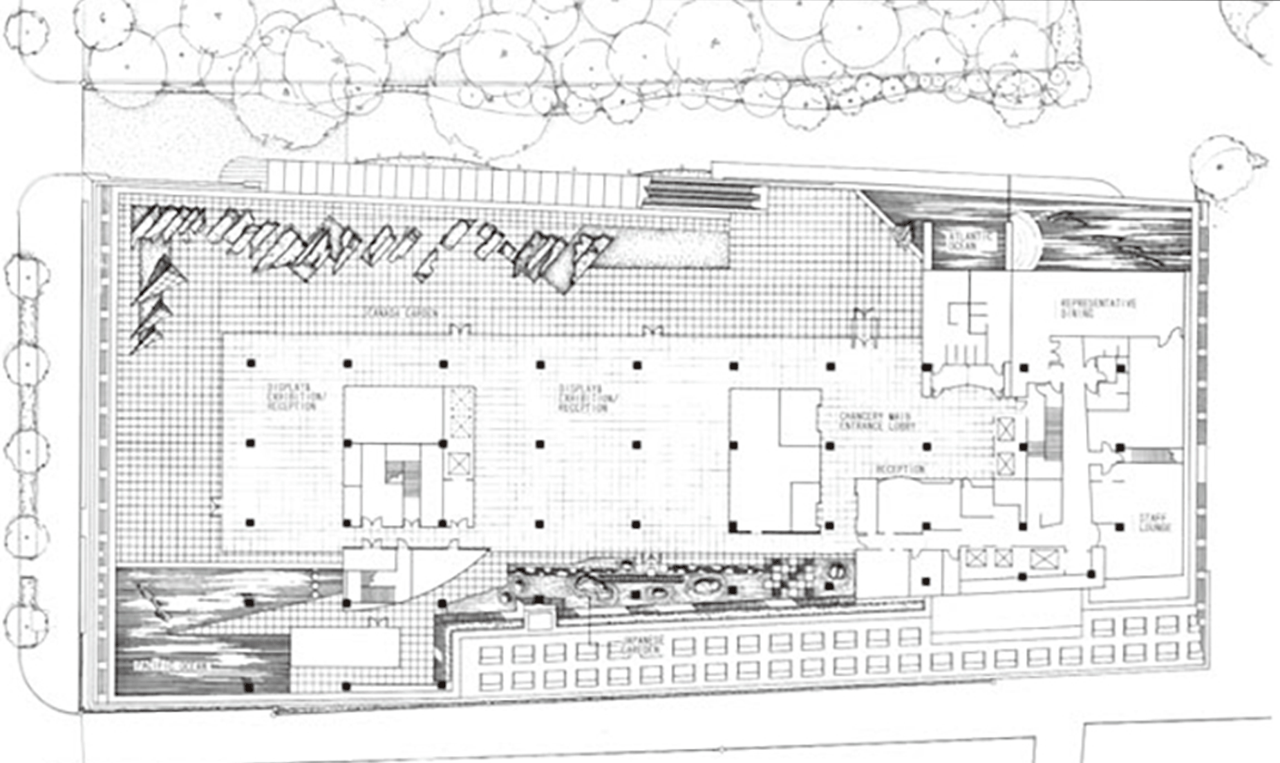 這ㄈ字形的參觀動線,據說靈感來自於一張世界地圖。電梯入口處的水池象徵大西洋: 由此啟航,首先經過塊石造景(象徵加拿大隆起的冰川地盾),一路延伸至端景(象徵北冰洋); 向左轉,進到位在西南角的另一座水池(象徵太平洋),再左轉,最終來到獨居幽暗一角的日式庭園。換句話說,作者試圖用這樣的手法,連結加拿大與日本兩地。咫尺天涯,將億萬里凝縮於方寸(這幾乎是日本庭園設計的傳統核心,縮小意識),勾勒出一幅大航海般的宏偉圖像。