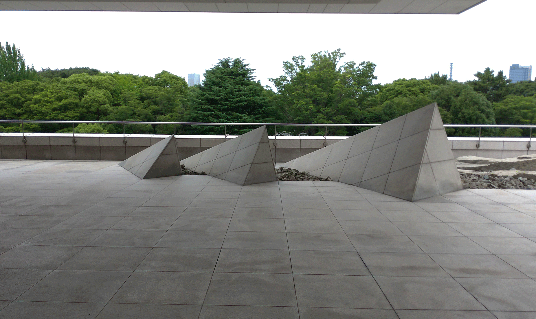 庭院呈ㄈ字形,三面包裹住大使館四樓的建築本體。從入口處往赤坂離宮的方向望去,首先映入眼簾的,是一片高低錯落、參差不齊的塊石群組,連同挑空的長長屋簷,指向離宮的綿延樹海。每一塊石頭以斜向45度角排列,有些表面尚留有開採的鑿痕(矢穴),與地坪整磚形成了鮮明的對比。這些造型粗曠的塊石,據說是設計意匠的表達,為了重現加拿大本土雄偉的冰川地貌。庭園盡頭有三塊金字塔的造型破土而出,旁邊則是一尊意味不明的雕塑。它的形體令人聯想到加拿大原住民因紐特人(Inuit)的傳統疊石。但左看右看,也像是一座石燈籠。