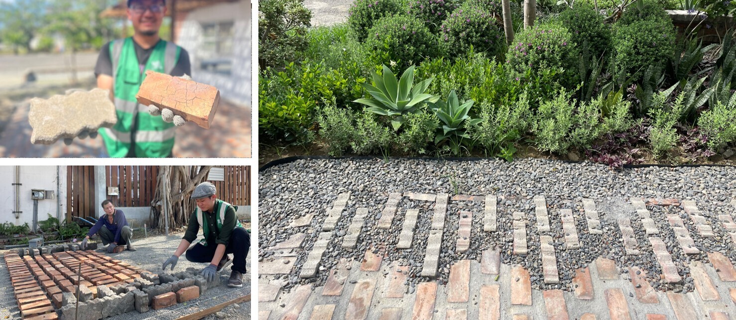 場地上現有的廢棄的水泥連鎖,經由設計新創立鋪透水工法,搭配當地火頭磚,回收在利用形成教學活動平臺。整體硬景工程減少60%外地物料使用,連同廊架整體降低80%的運輸成本以及相應的碳排放。