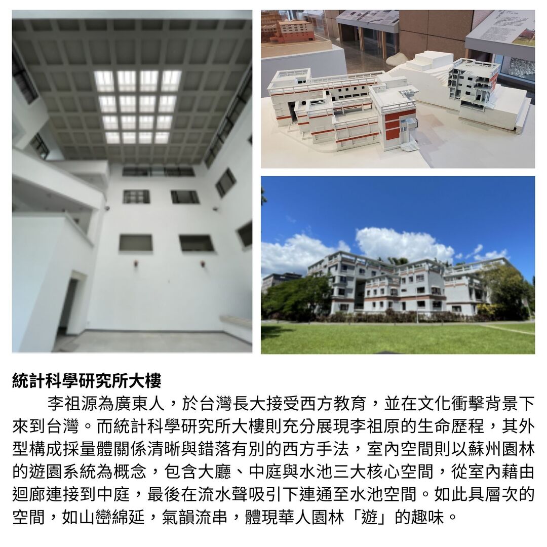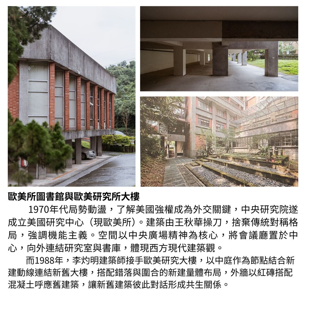 「因為各年代的建築都留下來了,所以閱讀院區的建築與空間,就像是同時在閱讀建築史及台灣戰後的發展歷史」,龔紋莎說,「許多戰後重要建築師的作品,都可在院區裡看見,從最早期跟著國民政府來台的基泰工程司、到張昌華、王秋華、王大閎、漢寶德、李祖原等人,相關的作品橫跨現代主義、地域主義、粗獷主義、後現代主義、再到台灣本土建築特色的追尋等不同時期與方向,而這些建物同時存在在院區裡,使得中央研究院院區宛如一座小型「建築萬花筒」,收納了台灣建築發展的多元語彙。另因為中央研究院的研究內容,與國家當下面臨的挑戰與未來發展的政策,其實是非常息息相關的,所以若連結建物與相關的使用內容,以及各該所中心的研究領域,某個程度還可以讀出台灣戰後以來國家發展的處境與面臨的挑戰。這其實提供了一個非常有趣、也少見的相互觀看的角度與路徑,亦即觀者可以在一個場域裡,透過建築觀看國家發展的歷史,或者反過來說,透過歷史的發展軌跡,給予一種嶄新的,重新認識一棟建築的角度。