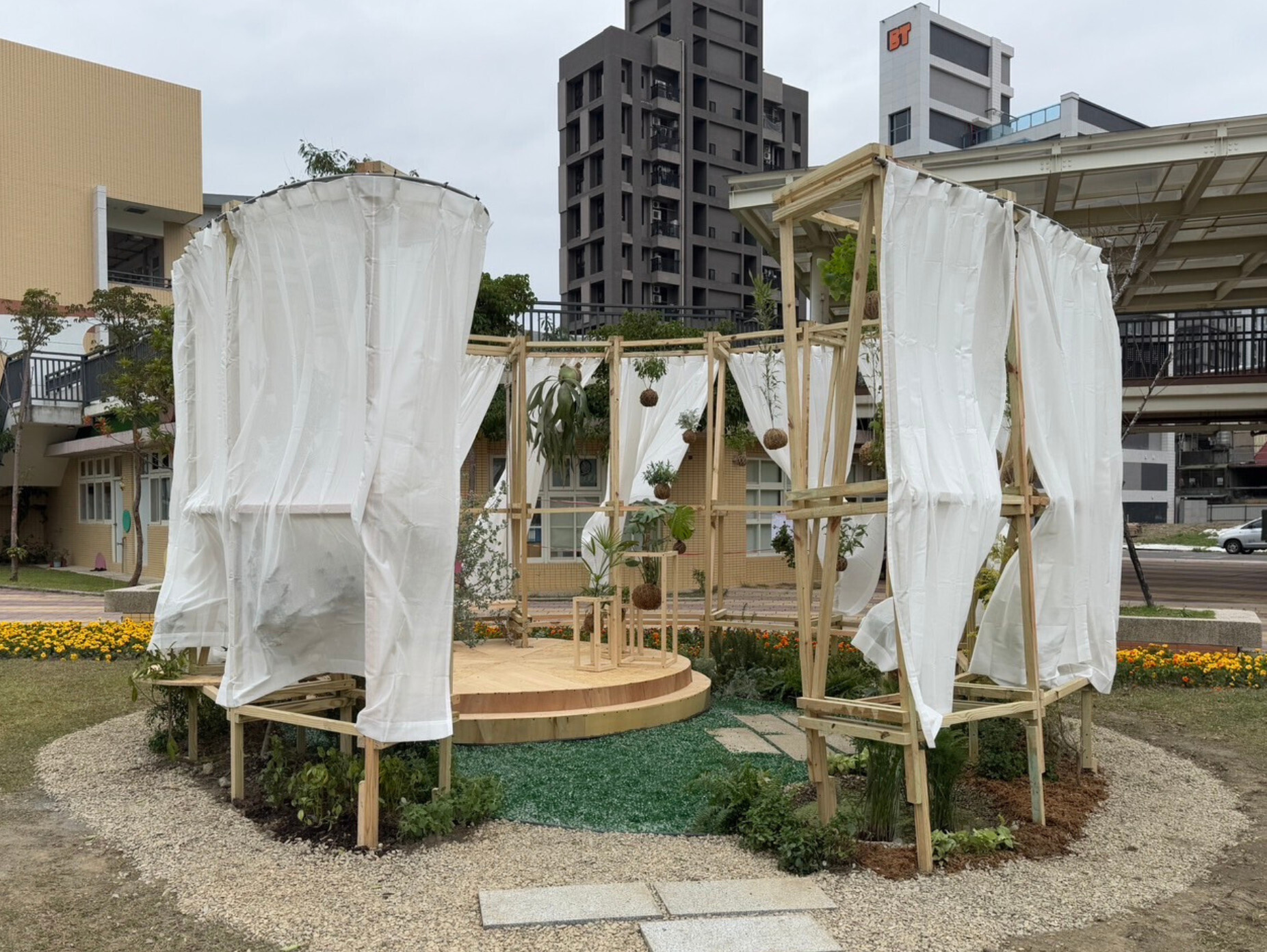 今年競賽基地神農百草公園位於新北市市定古蹟「先嗇宮」對面,競賽作品多見巧妙融合先嗇宮主祀「神農大帝」信仰,運用各種藥用、食用、芳療植物,設計出具「療育力」的空間,呼應園區以藥用植物教育為特色。