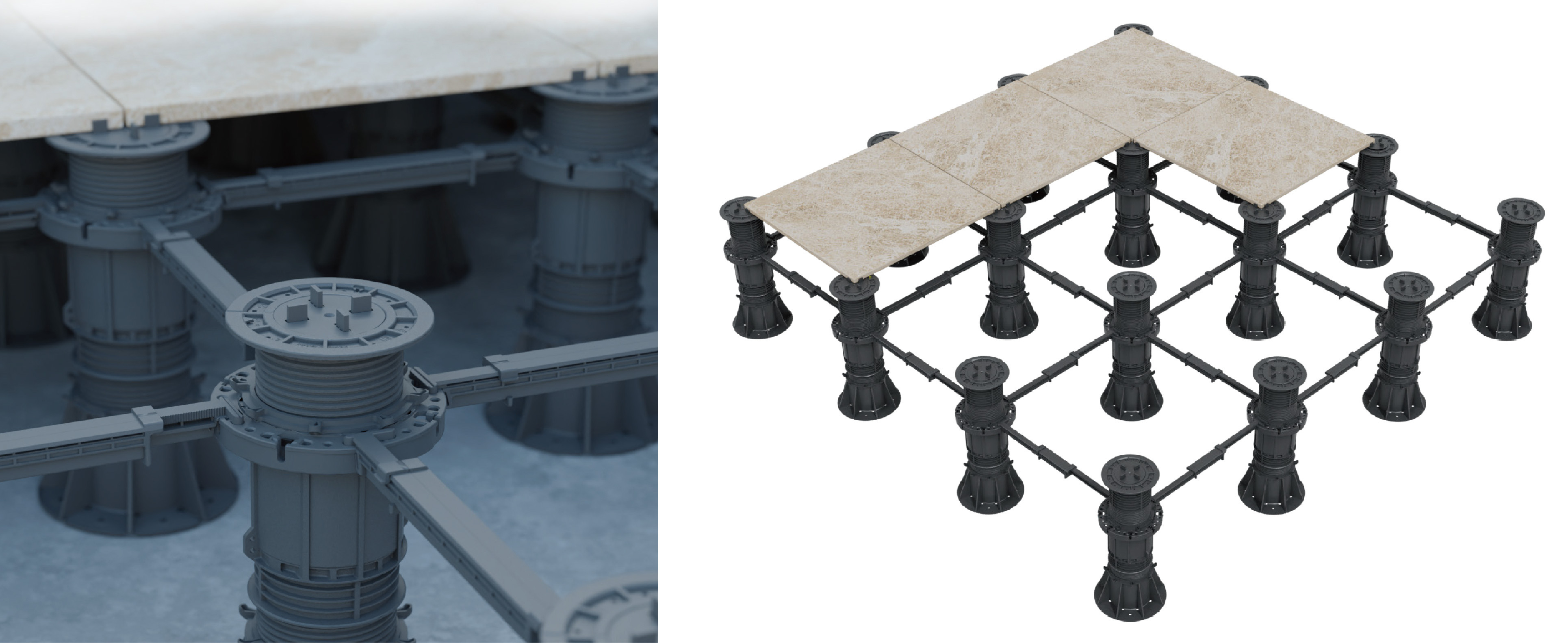 毫米級高度調整:基座的高度可以透過旋轉或增加連結器去調整高度,範圍從數公分到超過一公尺,讓施工人員輕鬆實現完美水平的鋪面。