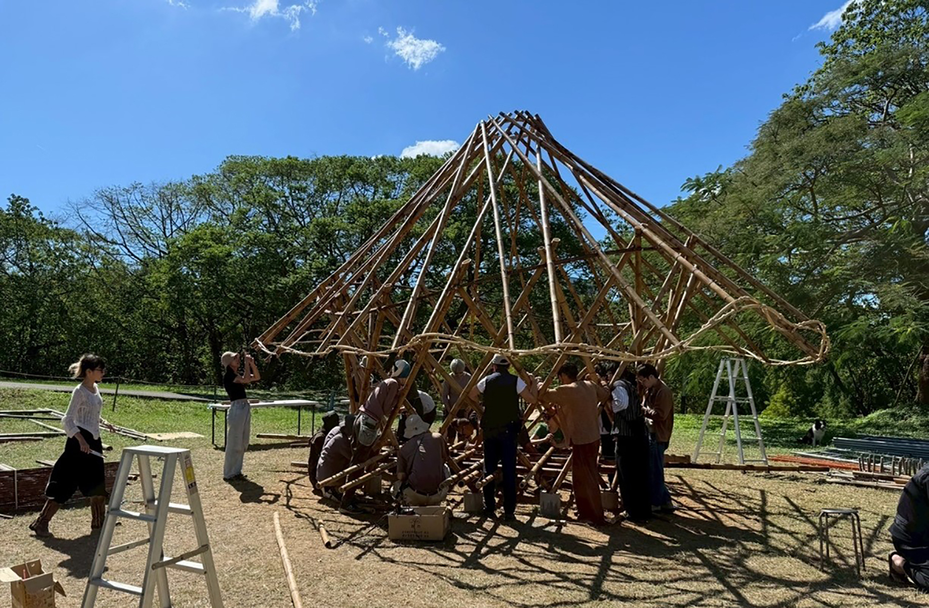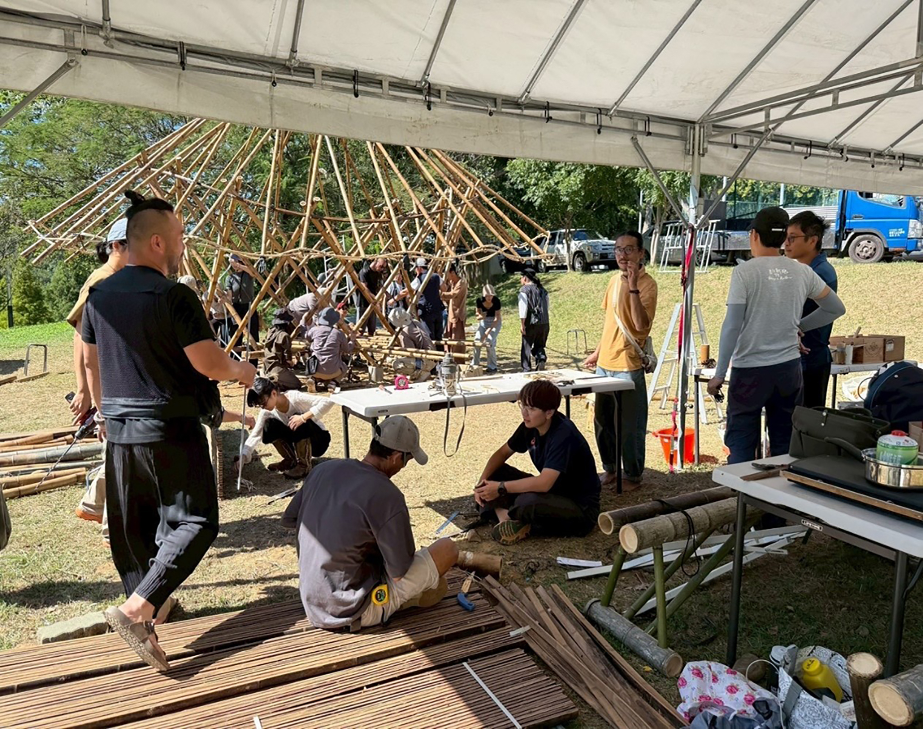 「模組化住宅與可負擔住宅是一個當今氣候變遷底下迫切的需求,因此我們希望能創造一個原型建築,讓任何人都可能搭建的建築原型,使用你所在國家可取得的材料與竹種。」2025 年 11 月,Bamboo U 首次與台灣竹會合作,於陽明交通大學舉辦為期五天的竹建築工作坊。Luis 帶領學員們建造這座小單元型的臨時性建築名為「Yurt(蒙古包)」,採用螺旋與圓形的空間語彙,以「互持結構(reciprocal structure)」為核心:每一根竹柱既支撐他人,也被他人支撐,展現出竹構建築在結構上的巧妙與穩定。