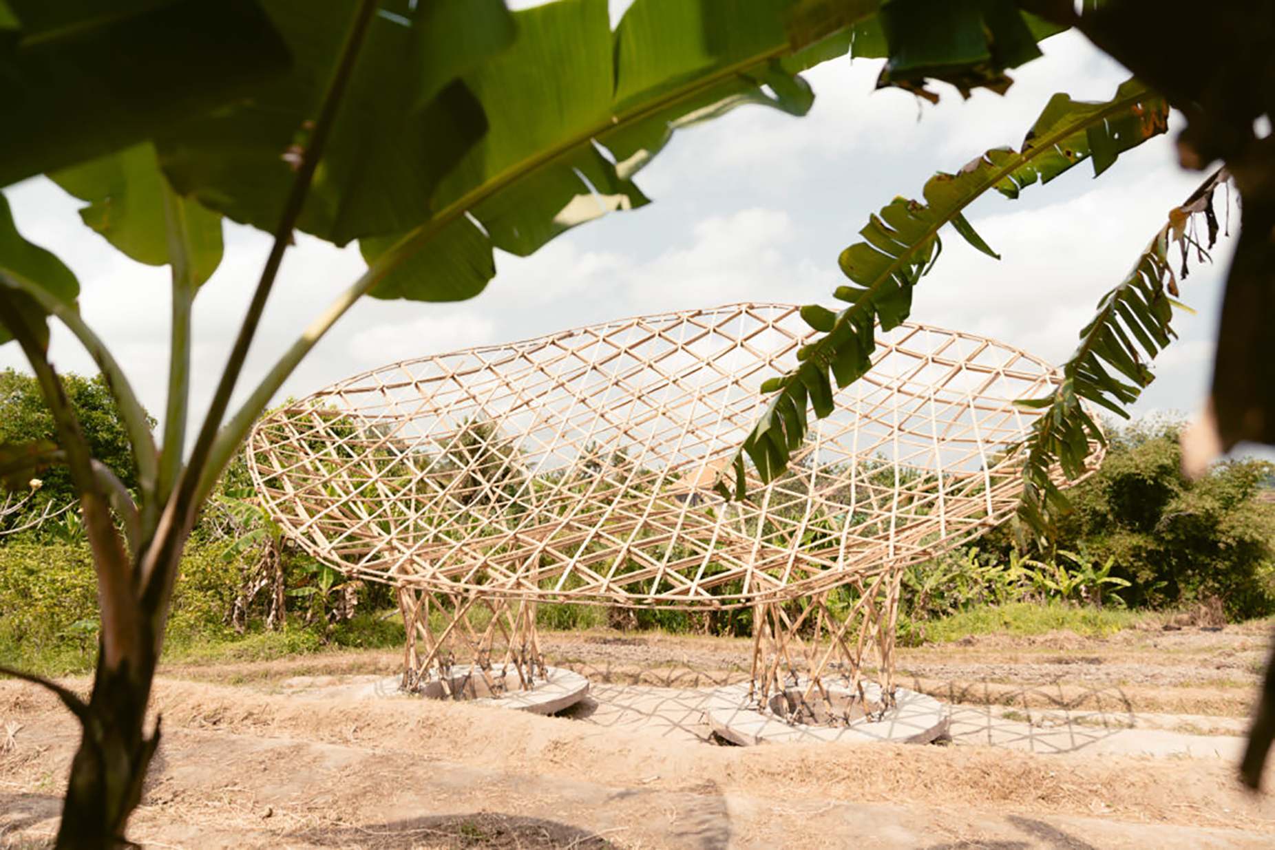 整體建築以 16 個地基為圓心展開,筆直的竹柱依不同角度傾斜與扭轉,堆疊出層層三角與菱形結構。透過設計與組裝,營造出類似漩渦的動態感,並設置上下兩個壓縮環(compression ring)來導引與平均施力,形成穩固的支撐系統。這座建築全程採用台灣在地竹材,並以簡易工具完成建構,過程中也促成國際工藝與在地材料的深度融合。