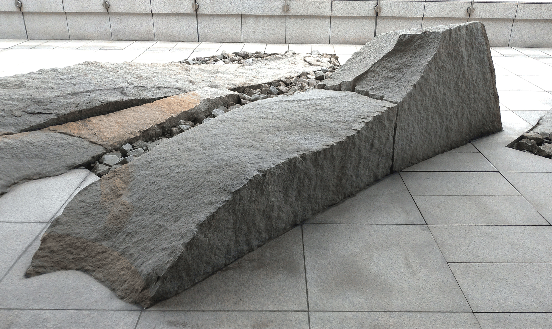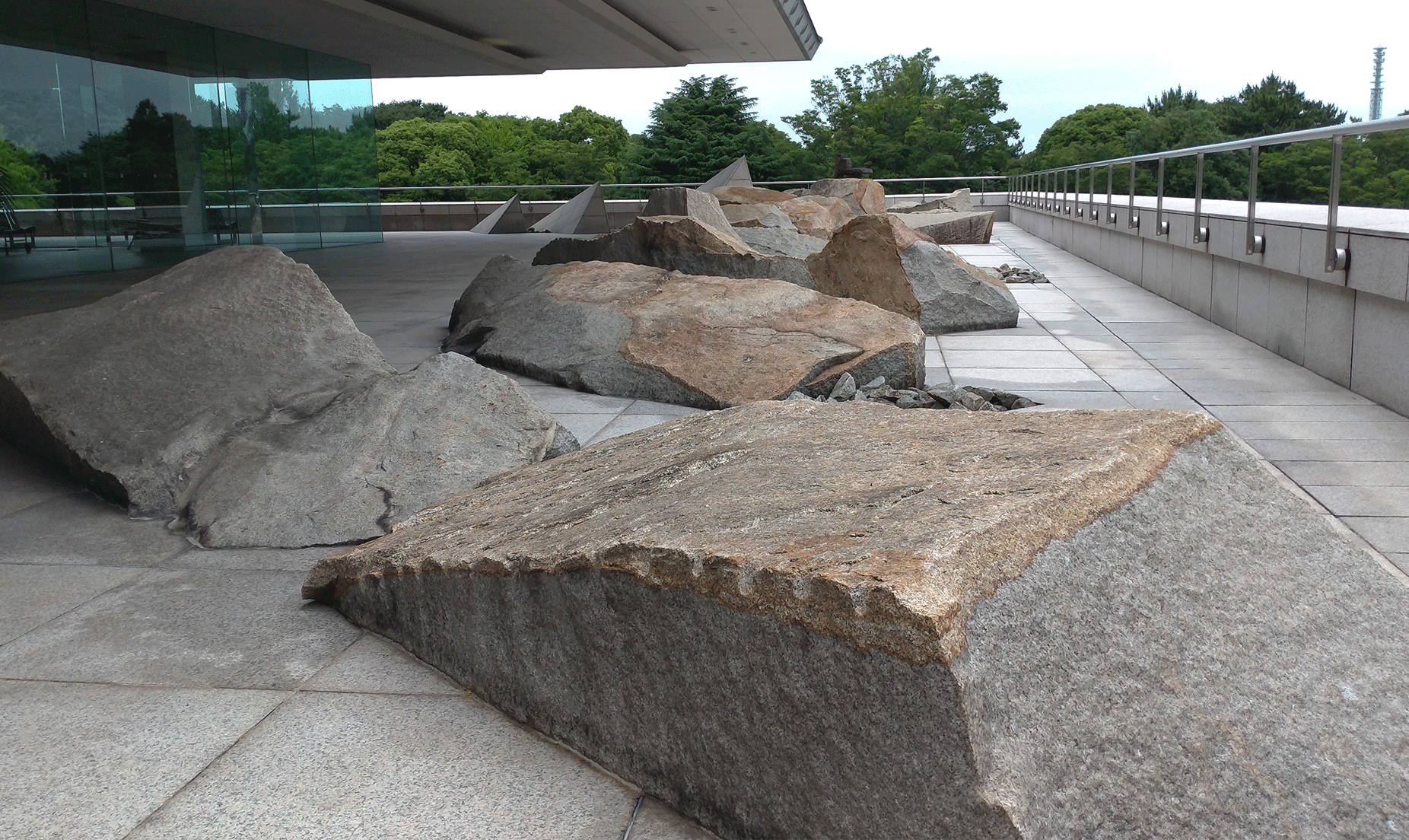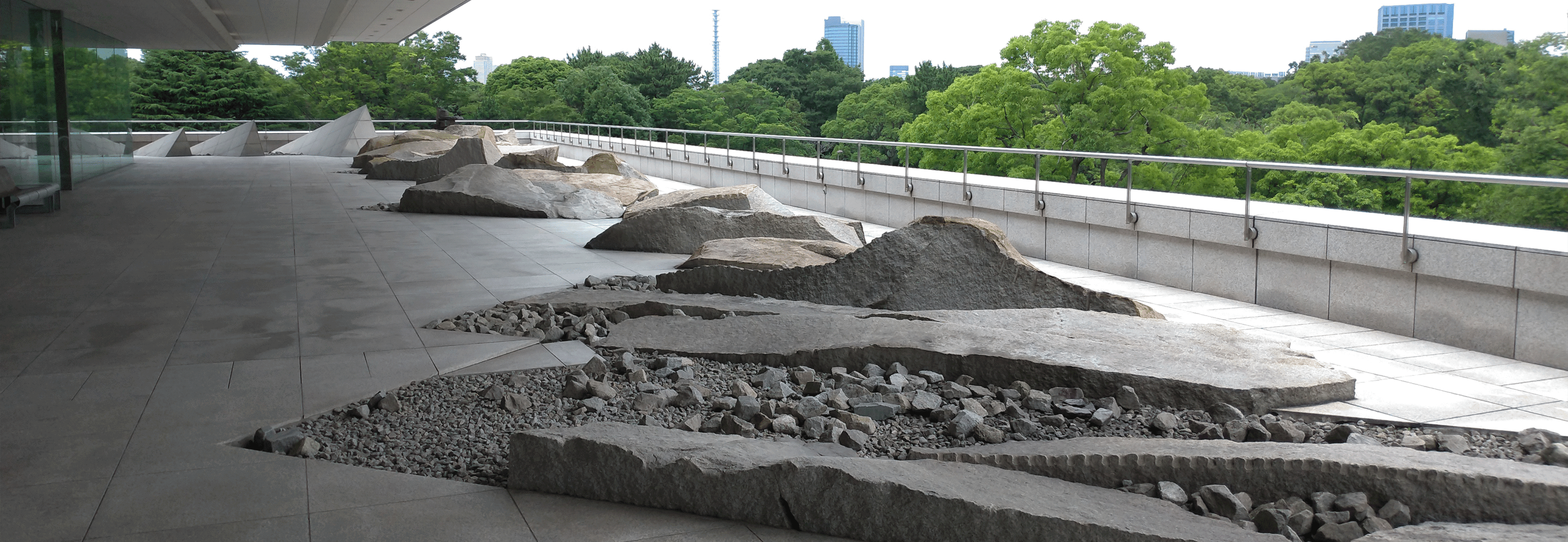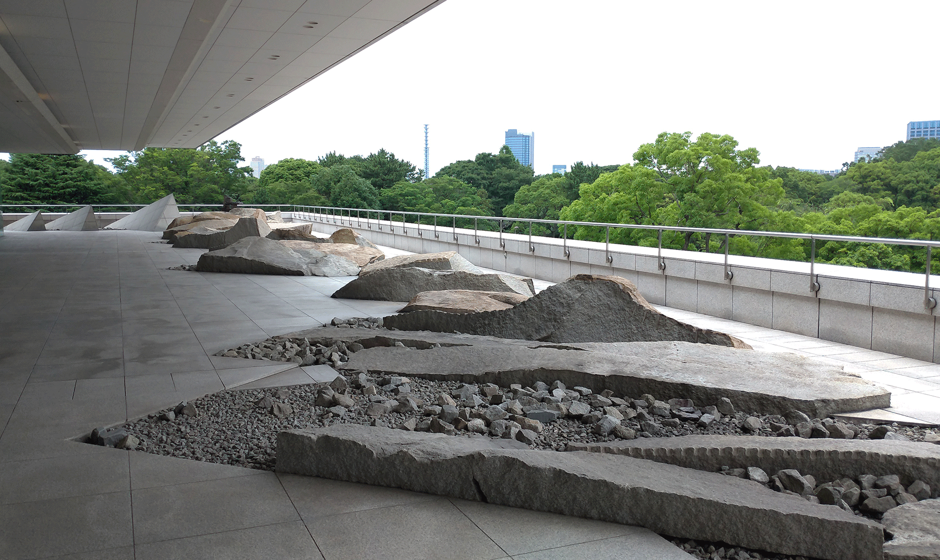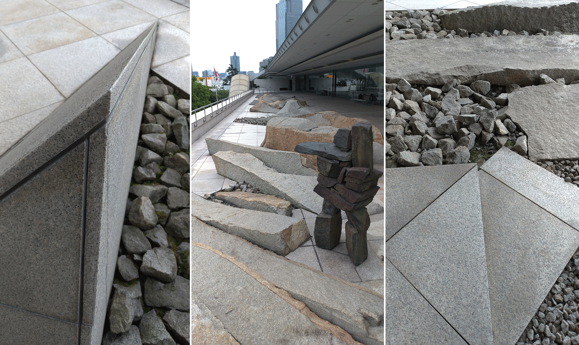 庭院呈ㄈ字形,三面包裹住大使館四樓的建築本體。從入口處往赤坂離宮的方向望去,首先映入眼簾的,是一片高低錯落、參差不齊的塊石群組,連同挑空的長長屋簷,指向離宮的綿延樹海。每一塊石頭以斜向45度角排列,有些表面尚留有開採的鑿痕(矢穴),與地坪整磚形成了鮮明的對比。這些造型粗曠的塊石,據說是設計意匠的表達,為了重現加拿大本土雄偉的冰川地貌。庭園盡頭有三塊金字塔的造型破土而出,旁邊則是一尊意味不明的雕塑。它的形體令人聯想到加拿大原住民因紐特人(Inuit)的傳統疊石。但左看右看,也像是一座石燈籠。