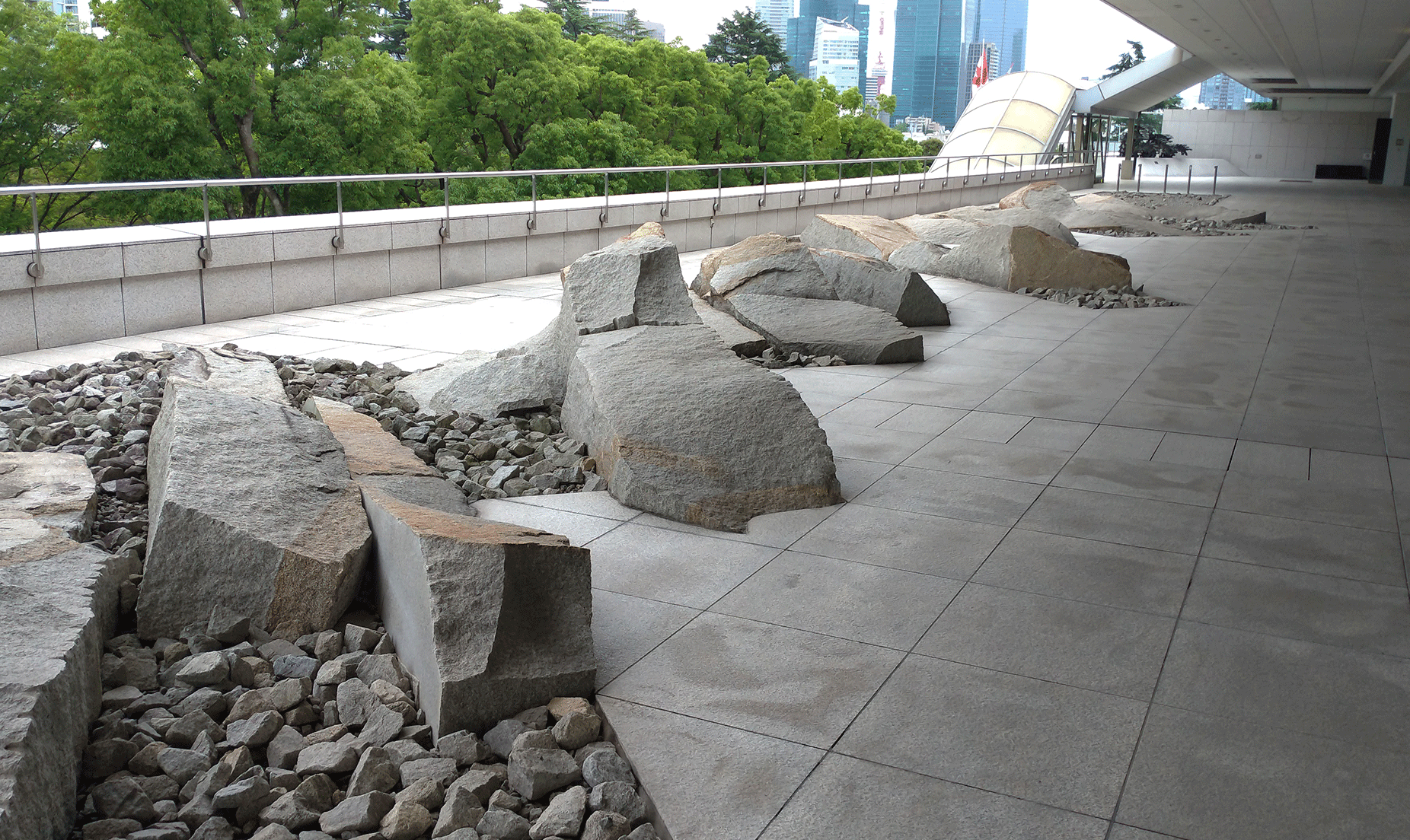 寫到這裡,我回想起了幾年前的那一次東京之旅。參觀了位在青山一丁目的日本加拿大使館庭院,也是枡野俊明早期的代表作(1991年完工)。直到最近,這個案例才又浮上腦海,或許可以用來說一說這所謂「幽玄」的奧義吧! 該使館位於都心的高檔地段,往東邊走幾步就是虎屋羊羹赤坂總店,往西邊走幾步就是神宮外苑銀杏並木。庭院對外開放,進了使館大門後填寫表格出示證件,經過基本安檢程序之後,搭上一道長長電梯,就來到位於四樓的庭院。