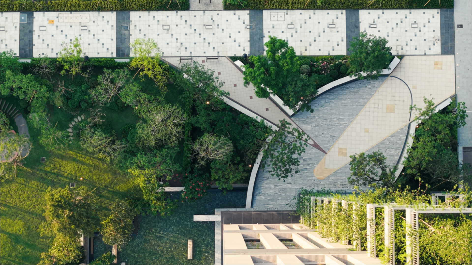 「大塊森濤」是台中市鼓勵宜居建築設施設置及回饋辦 法執行的較大陽台垂直緑化的景觀大樓。建築配置實為地面 層保留比較大的庭園空間、實設建蔽率降到18.4%。 「大塊森濤」的景觀設計,以打造一座結合自然、生態 與社區交流的綠色中庭為核心理念,總面積達3550平方公 尺,宛如一座專屬於住戶的小型社區公園。中庭空間依不同 使用需求規劃出多元場域,整體景觀提升了生活的舒適度與 休閒性,也透過自然環境的引入調節微氣候,形塑出健康、 宜居且充滿綠意的生活環境。 結合自然、生態與社區交流的中庭 「大塊森濤」以自然共生為核心理念,期望由外而內皆 能體驗蓬勃生機。設計自外圍厚實綠意的步道展開,經由林 蔭環繞的入口廣場,延伸至結合地形與寬闊水景的活動草坪, 並銜接室內外共享的交誼空間。無論住戶在室內閱讀、健身, 或於戶外休憩遊憩,皆能被綠意所環抱,進而融入多元而豐 富的自然環境體驗。