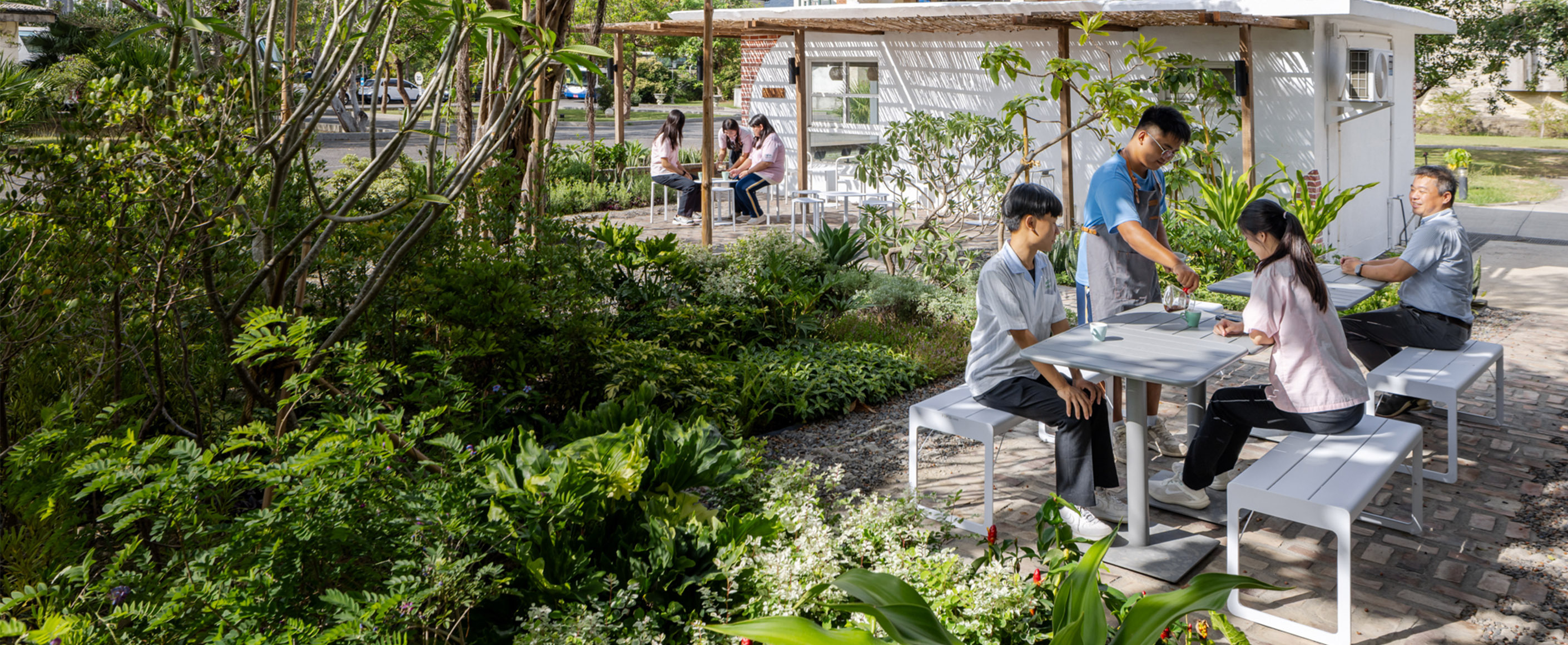 位於台灣最南端的恆春半島,具備有別於本島的熱帶乾旱形氣候,同時擁有多樣的恆春特有種植物,以及文化產業的深厚的軌跡,極具景觀特色與潛力。恆春工商長期推動生態環境教育與地方觀光,為了延續環境教育、深化文化記憶並創造社區交流場域,特別委託鳴築景觀進行設計改造,將校園前場的實習咖啡外部空間轉型為兼具學習功能、彰顯恆春特色的綠境學堂。