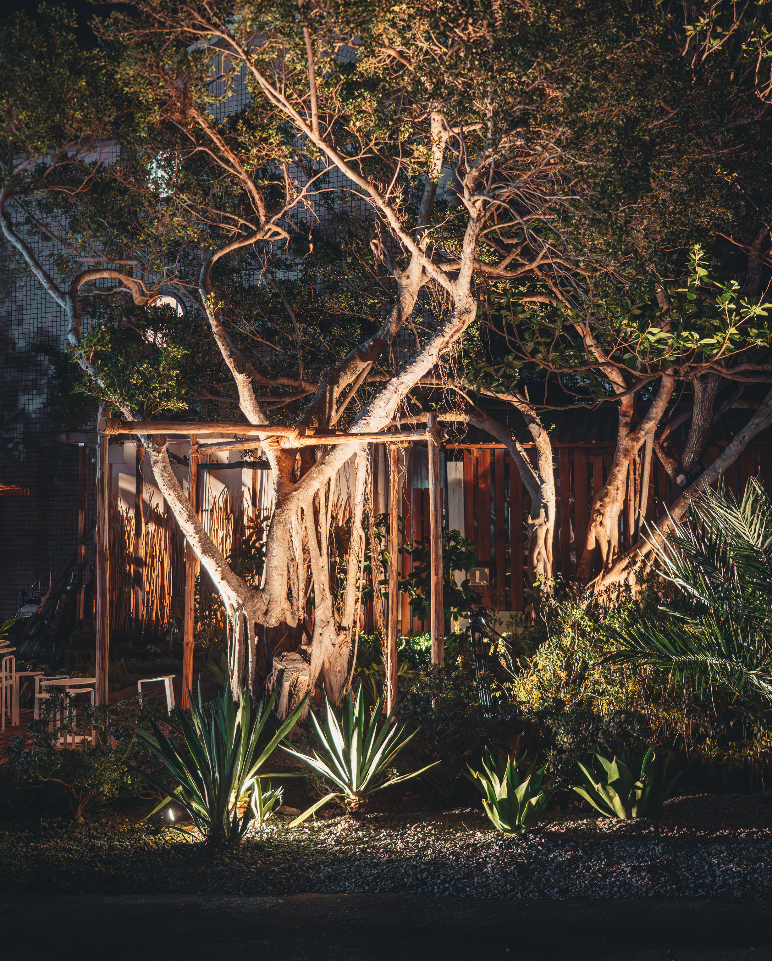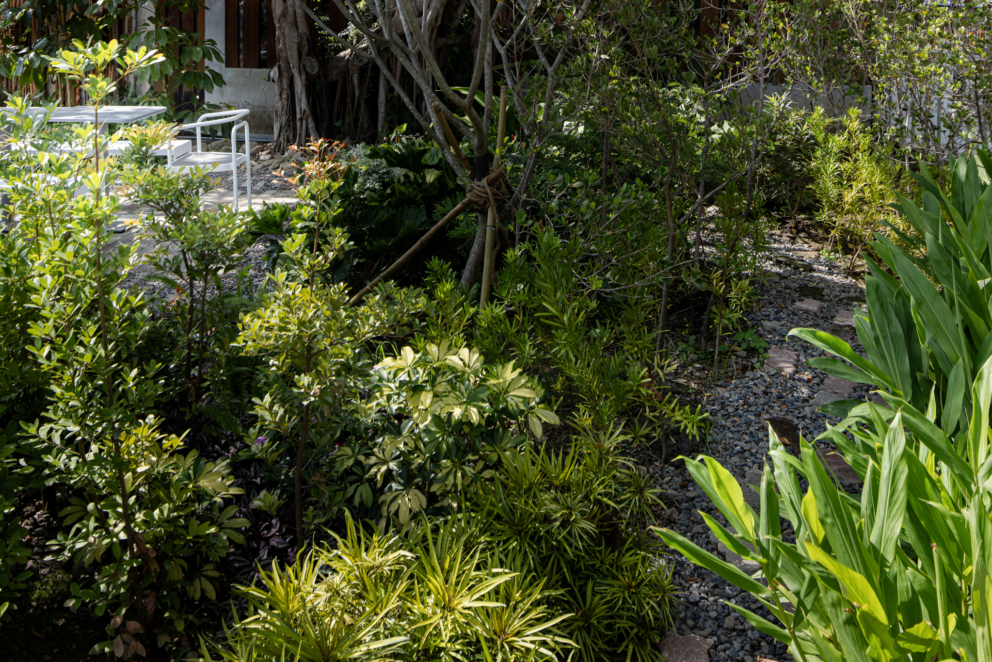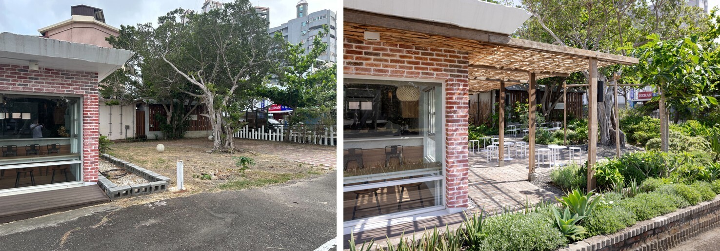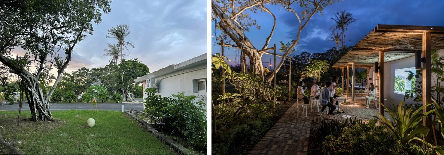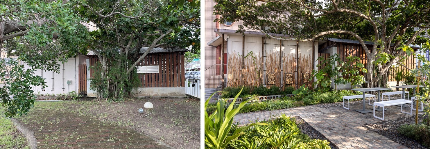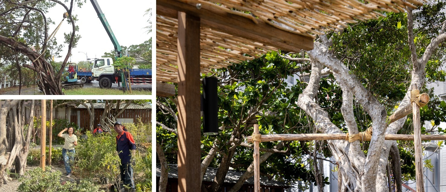 小犬颱風後,原本場地上的小葉榕被颱風吹歪傾斜30度,同時又有褐根病的潛在擔憂,但是如果砍除之後整個空間則失去了重要的遮蔭空間。鳴築景觀與樹醫籃世旭老師合作,進行診斷,救治,以及扶正,配合既有喬木如正榕、大葉欖仁等,搭配靈活組合的家具,形成「榕樹小學堂」與「共生樹蔭餐桌」,提供舒適的學習、交流與休憩場域。