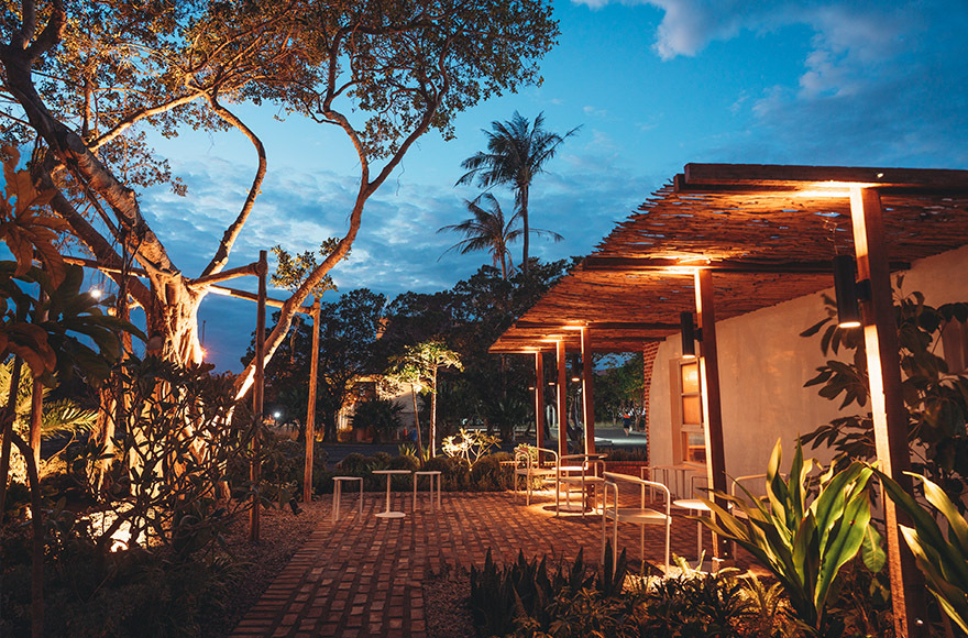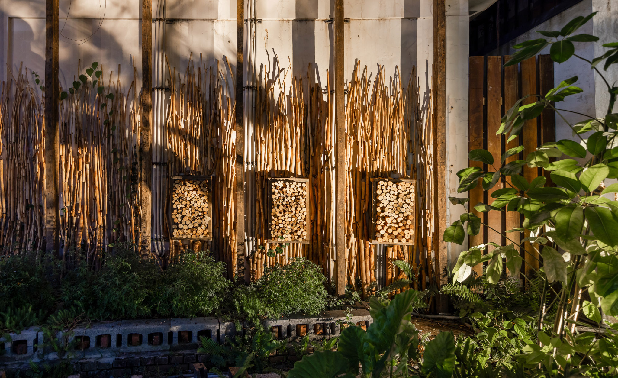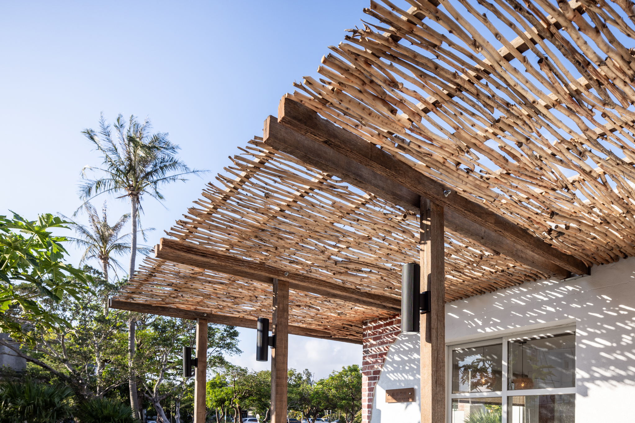 在景觀構築物上,與木工藝術家楊宗熏老師合作,砍伐入侵物種銀合歡,枝條重新處理再造成爲場地上急需的遮陽廊架。而廊架的大木框架,也是恆春當地老房子拆除之後保留下來的。而在咖啡屋的景觀燈籠,則是邀請編織大師“瓊麻的女兒”王美又老師,將瓊麻帶回校園主景,同時將瓊麻編織帶入教學工作坊的一部分。